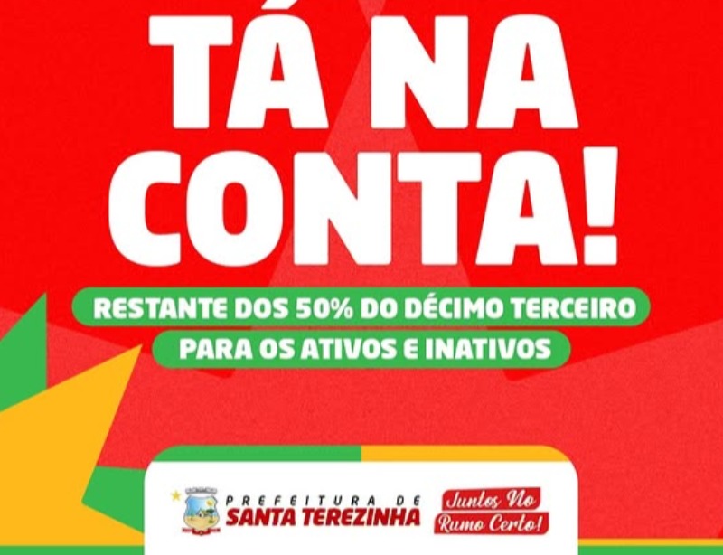 A Prefeitura de Santa Terezinha realizou, nesta sexta-feira (12), o pagamento da segunda parcela do 13º salário para todos os servidores púbicos. A medida contempla tanto os funcionários ativos quanto os inativos, reforçando o compromisso da gestão com a valorização do serviço público e o cumprimento do calendário financeiro. De acordo com a Secretaria de